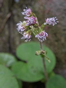 Flowers on the aptly named Winter Heliotrope (Petasites pyrenaicus). The flowers and leaves of this heliotropic plant gradually follow the sun from east to west and during the night turn back to the east to greet the next dawn.